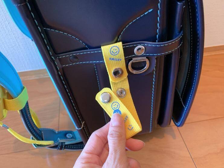 まずはランドセルのサイドベルトに本体を通して上のボタンをポチリ。あっという間にランドセルに設置完了です!手荷物をつける際は、荷物の持ち手をラクラクランドセルベルトに通して下のボタンをポチリするだけです。
