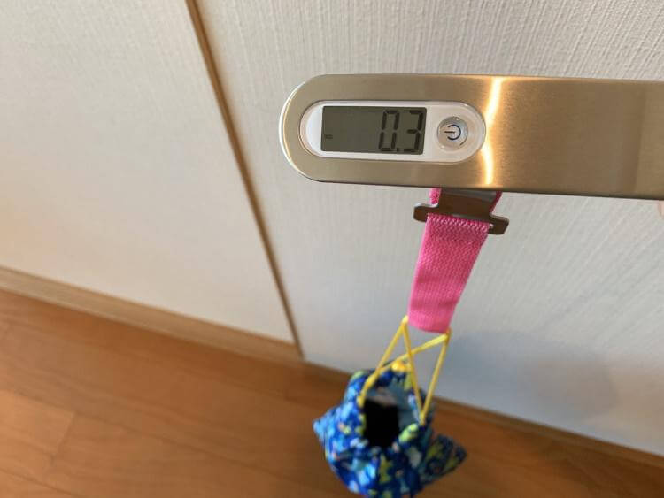 次は体操服袋。長袖の体操服と半ズボンを入れて測ったところ、300gでした。上履きや体操服のサイズにより重さは異なるかと思いますが、小学生マストの手荷物はおおむね500g以内と言えるでしょう!