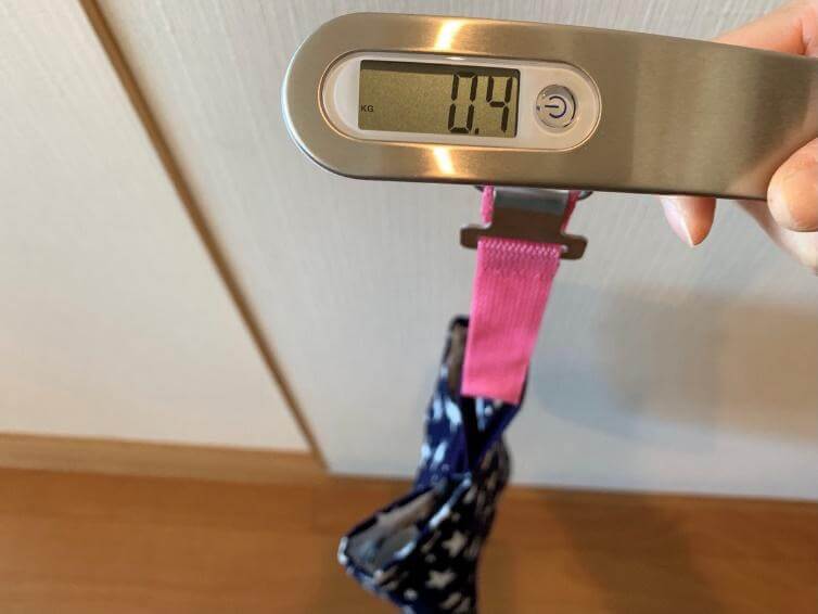 ラクラクランドセルベルトの耐荷重量は約500g。念のため、いつもの手荷物類の重さを測ってみました!まずは上履き袋。長男の20cmサイズの上履きを入れて測ったところ、400gでした。