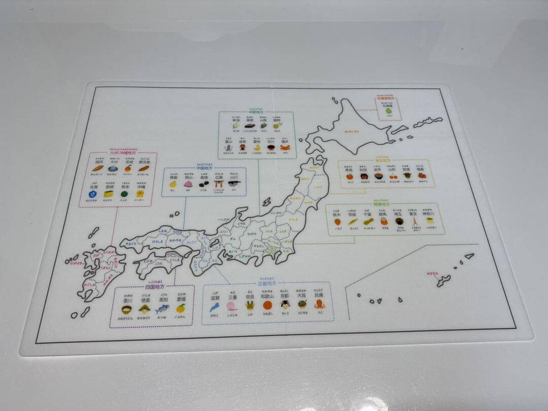 地図の外側には、漢字の県名(ふりがな付き)が地方区分によって色分けされ、県の名産品まで記載されていました!一見シンプルですが、見れば見るほど圧巻の情報量に驚き!