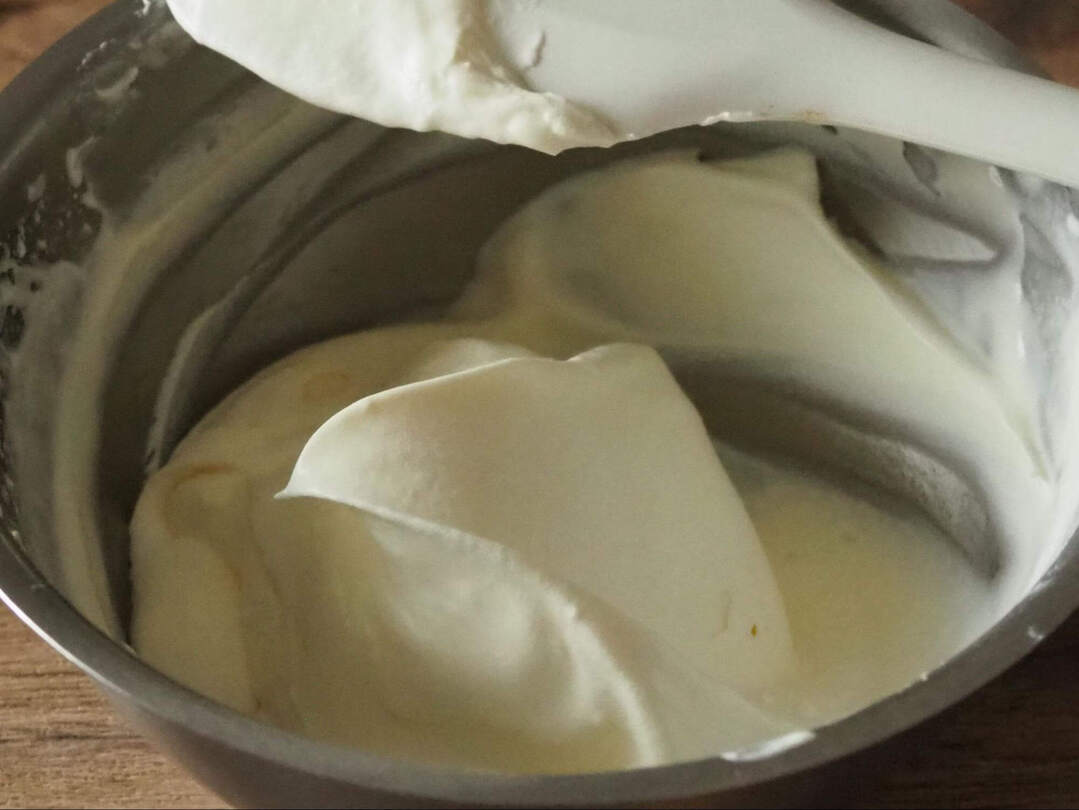 持ち上げたときに、角が立ったあと先端がおじぎするくらいの固さにしておくと、デコレーションしやすくなります。