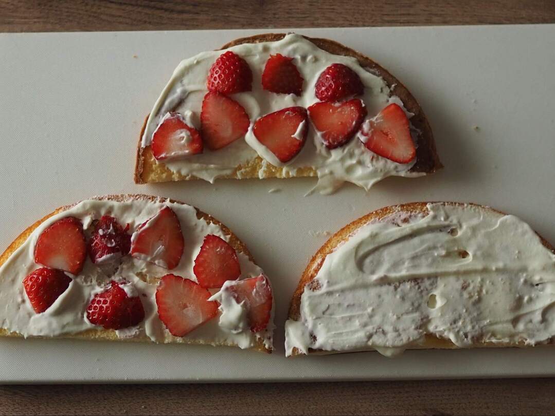 イチゴスぺシャルは3枚のスポンジが重なっているので、はがしてそれぞれに生クリームを薄く塗ります。そのうち2枚には薄切りにしたいちごをのせます。
