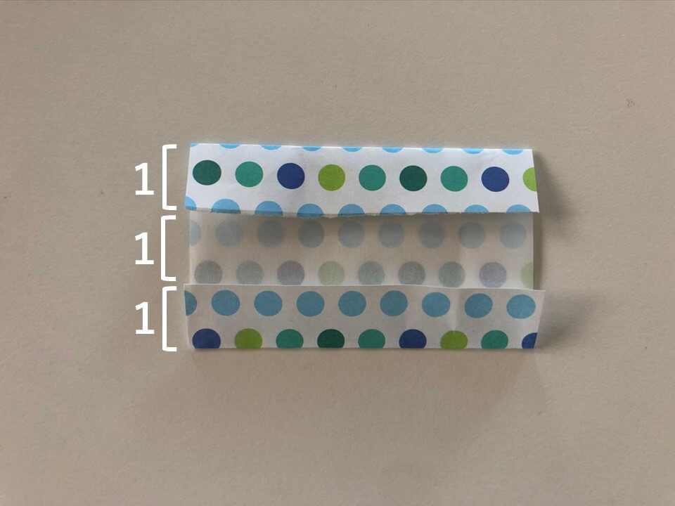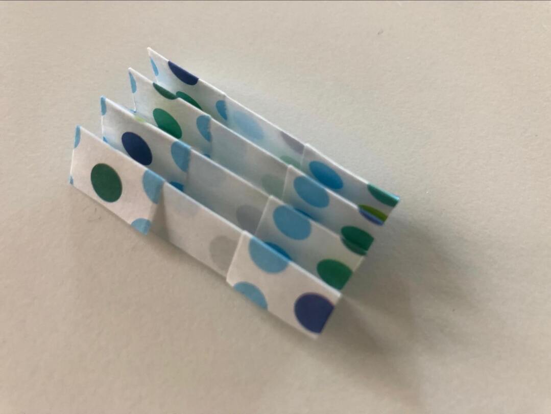 ▲3でつけた3本の谷折りの間に"山折り"を作っていきます。山折りが4つ・谷折りが3つで写真のような蛇腹(じゃばら)の状態に!