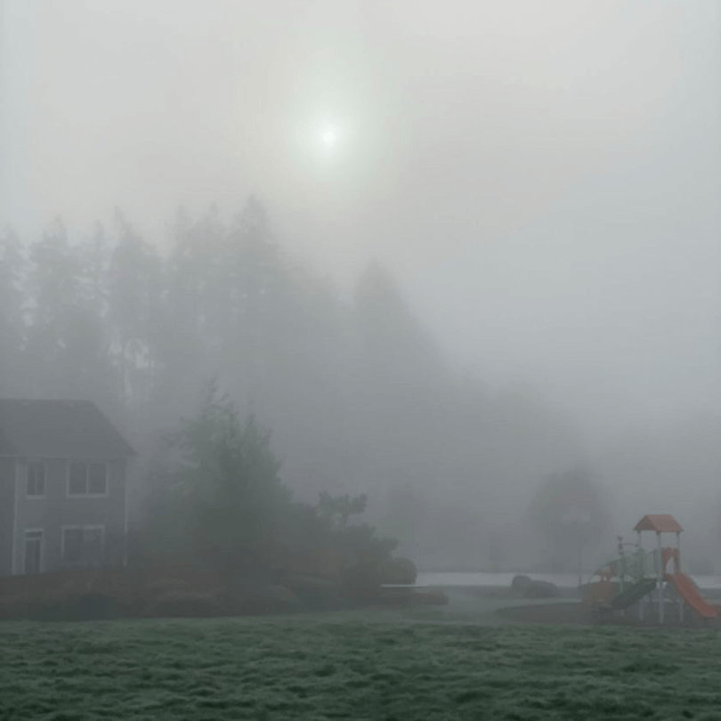 こちらは友人撮影の実際のワシントン州の霧の様子。かなり霧が濃いですね。