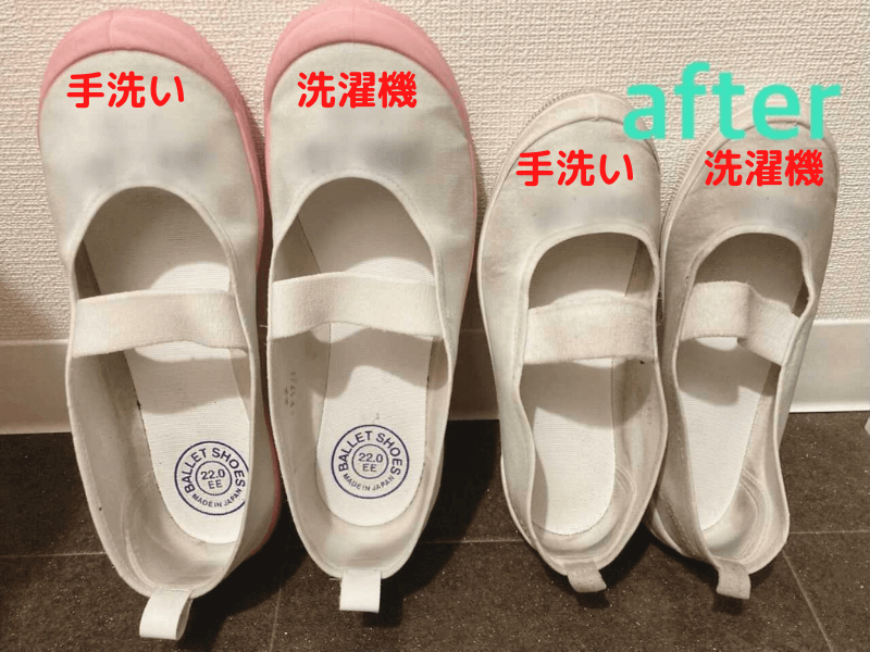一方、そもそも汚れが多くなかった上履きは、手洗いと上履きネットに入れて洗ったものであまり差を感じませんでした。