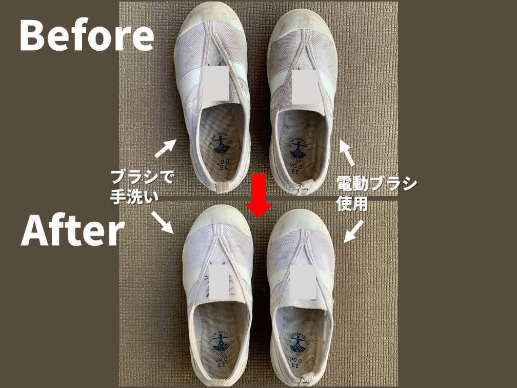 実際にどれぐらい汚れが落ちるのか、上履きの片方をブラシで手洗いし、もう片方を電動ブラシで洗って比較してみました。