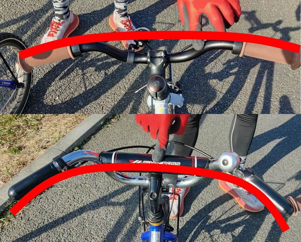 おすすめなのは、画像上のハンドルがフラットなタイプ。自転車に乗れるようになるためのコツは「自転車の中心」を理解することですが、フラットなタイプは握ったときに自然に前傾姿勢になり、バランスを取りやすくなります。