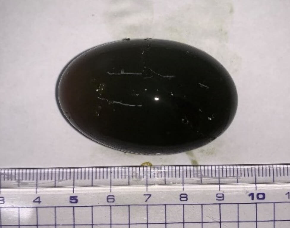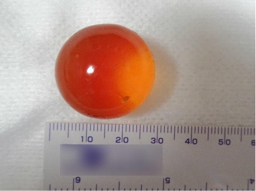 摘出された異物は4cm×2.5cm大の鶏卵型の樹脂製の物質であった(写真2参照)。