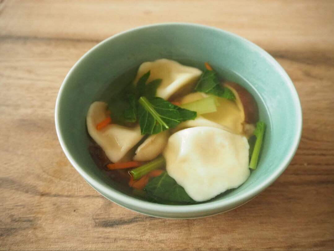 冷蔵庫にある野菜をスープで煮て、最後に水餃子を凍ったままスープに入れて5分煮れば、立派なメインが完成。水餃子自体にも味がしっかりついてるので、スープの味つけは控えめでも大丈夫です。