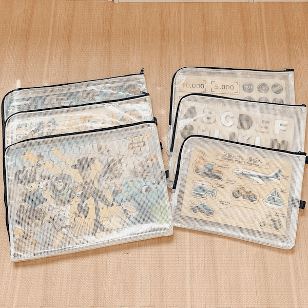 ビニールネットケースなら中身が見えるしコンパクト。子供用のパズルであればぴったりサイズで収納することができます。