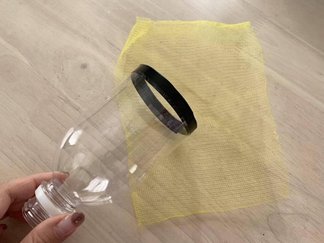 ネットは切り口側にかぶせるようにして取り付けます。ペットボトルの直径を目安に適当な大きさにカットしておきましょう。