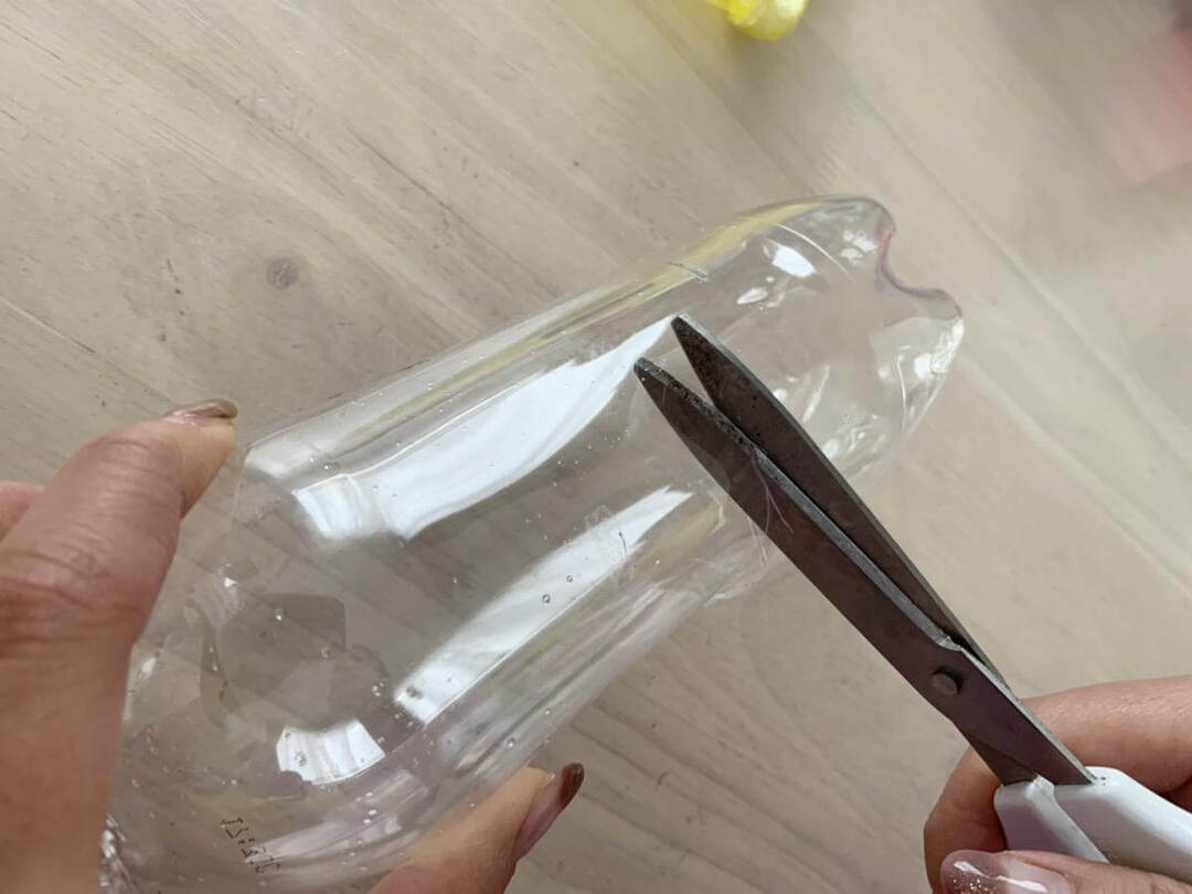 まずはペットボトルの底部分をはさみでカットします。切り口で手を切ってしまう可能性もあるので、必ず大人がやりましょう。