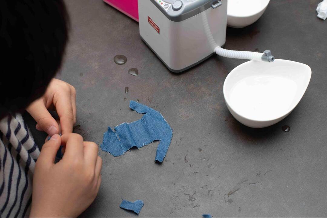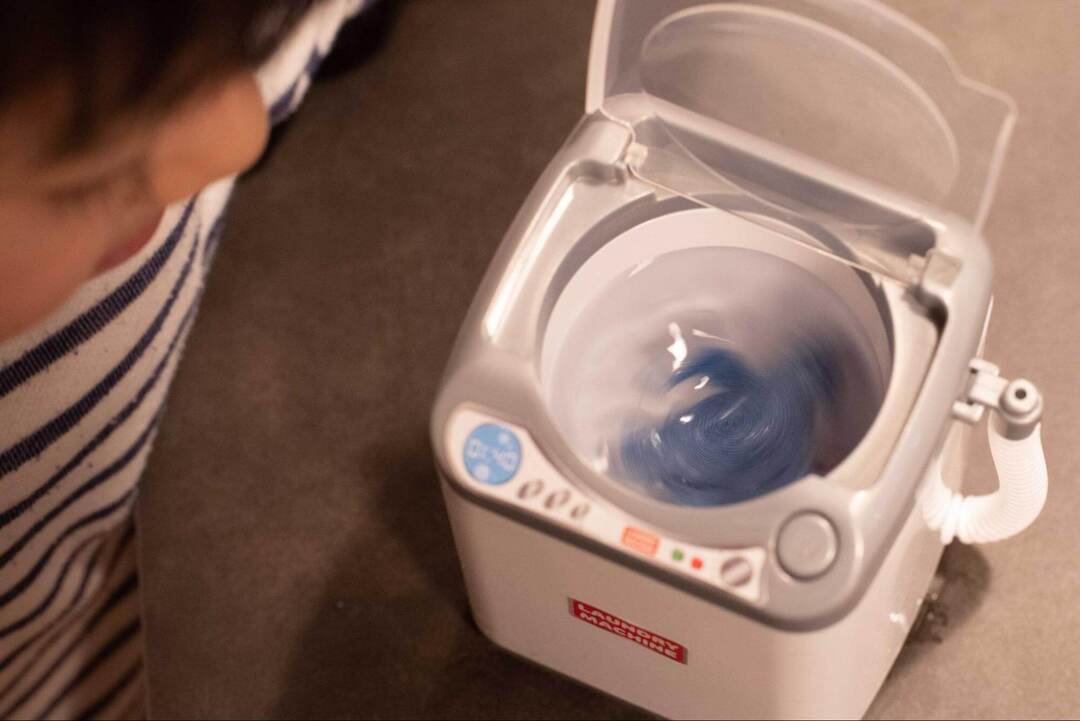 水を張ったミニ洗濯機に洋服をいれて、電源ボタンを押すと…