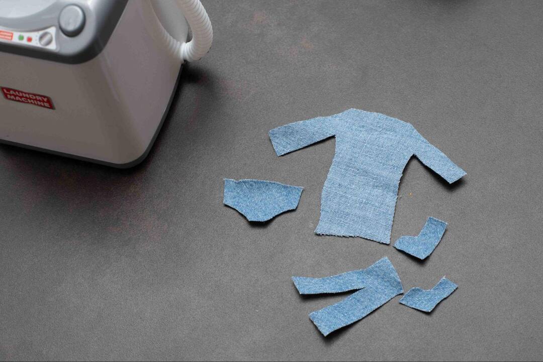 といっても、片手サイズのミニ洗濯機はハンカチを入れるのも難しい大きさ。というわけで、6歳の息子と一緒にボロ切れを洋服の形にカットして入れてみました♪