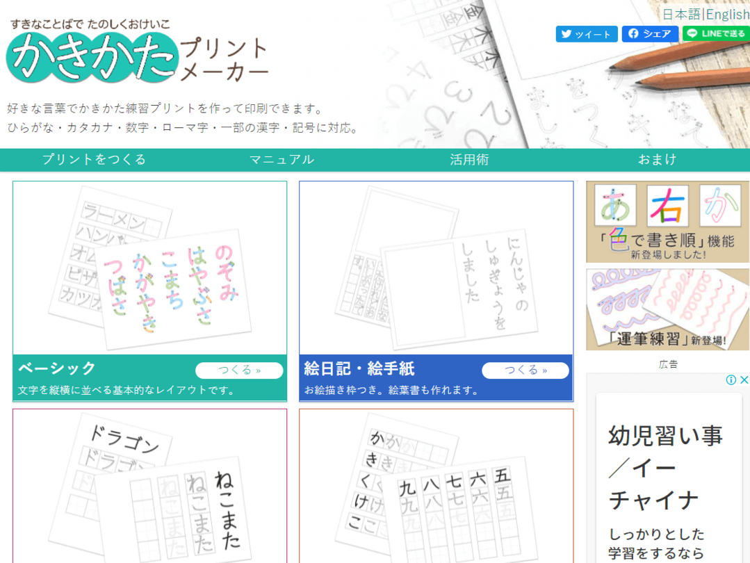 「かきかたプリントメーカー」は、子どもの好きな物や子どもの名前など何でも好きな言葉でプリントを作れるサイト。