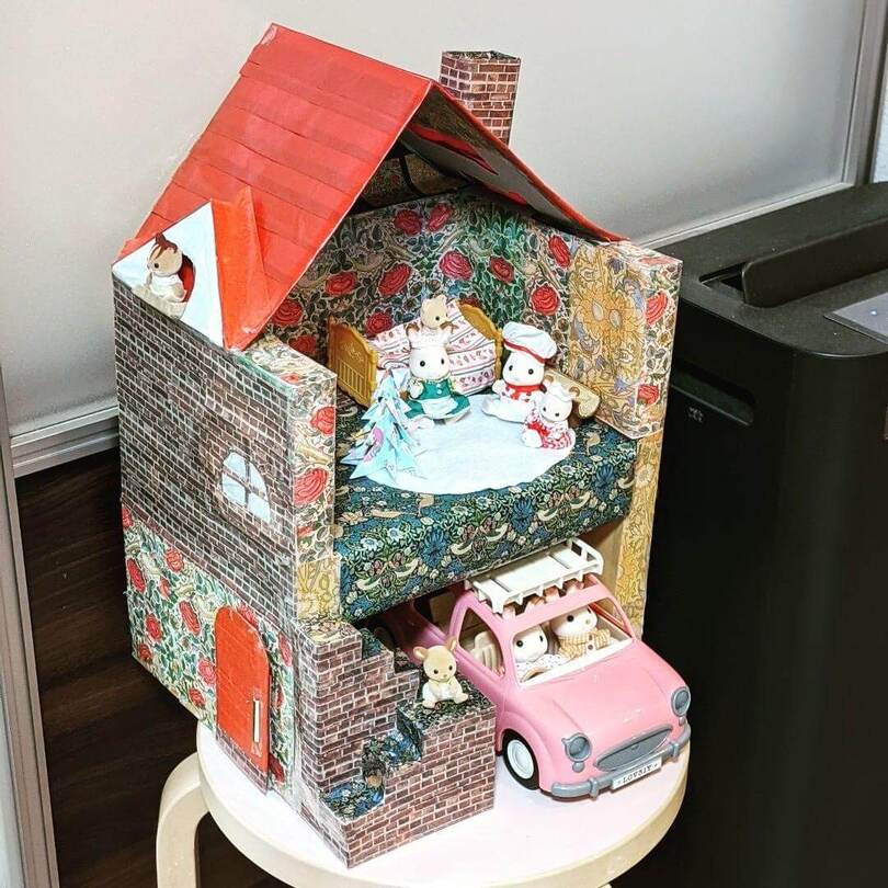 こちらのとっても可愛らしい2階建てのシルバニアハウス、市販のおうちを買おうか迷って、「とりあえず手作りで様子見しよう♪」と作られたものだそう。