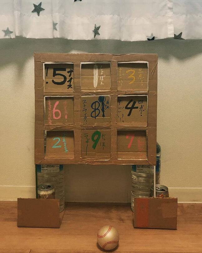 続いては、家族や友達との時間が盛り上がること間違いなしの段ボール製ストラックアウト。おやこで2時間かけて作られた力作なんだそう!