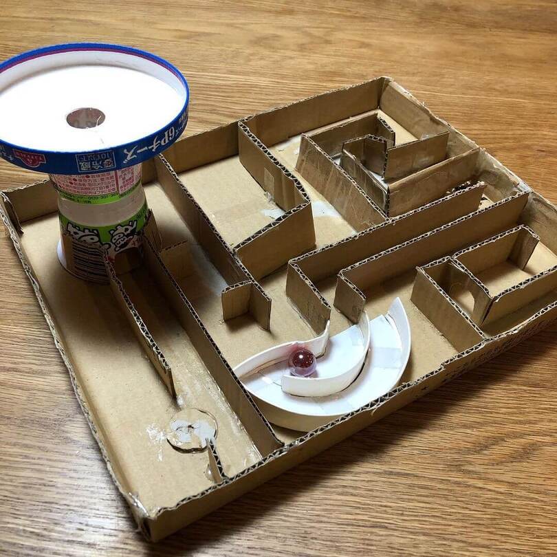 段ボールに加えて、チーズやヨーグルトの空き箱を使って作った迷路は、本で見たものを参考に作ってみたそう。工夫がたくさん詰まっていますね!同じ高さで揃えられた壁もとってもきれいで、細部にこだわりが感じられる作品です。