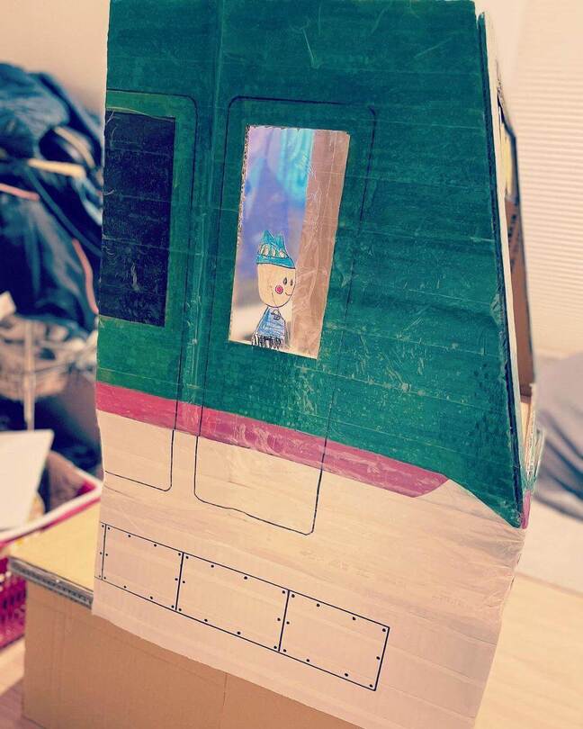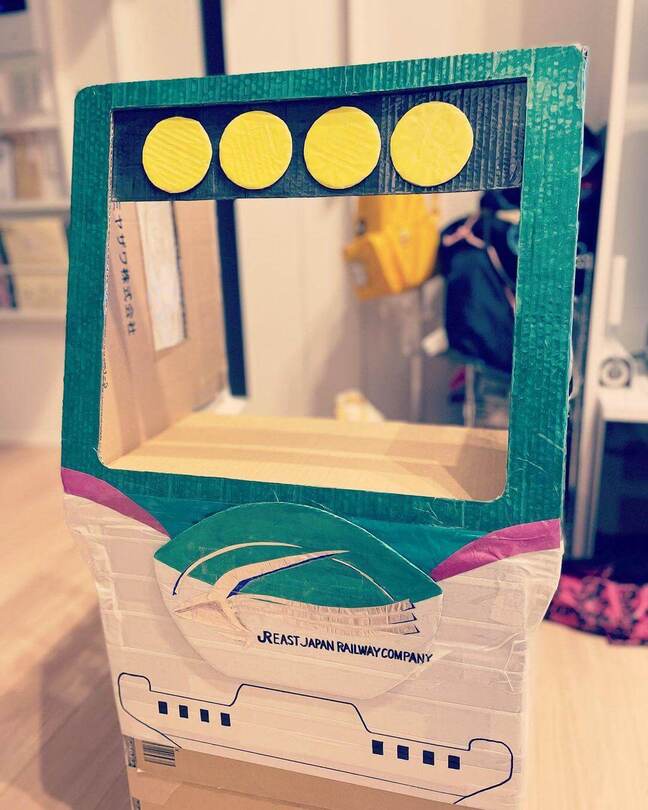 乗り物大好きな息子さんのために作られた段ボール製の新幹線はやぶさ。新幹線の特徴をしっかりとらえて作られており、おうちの中で旅をしている気分になれそう。パーツごとに切り貼りすることで、立体感が生まれています。