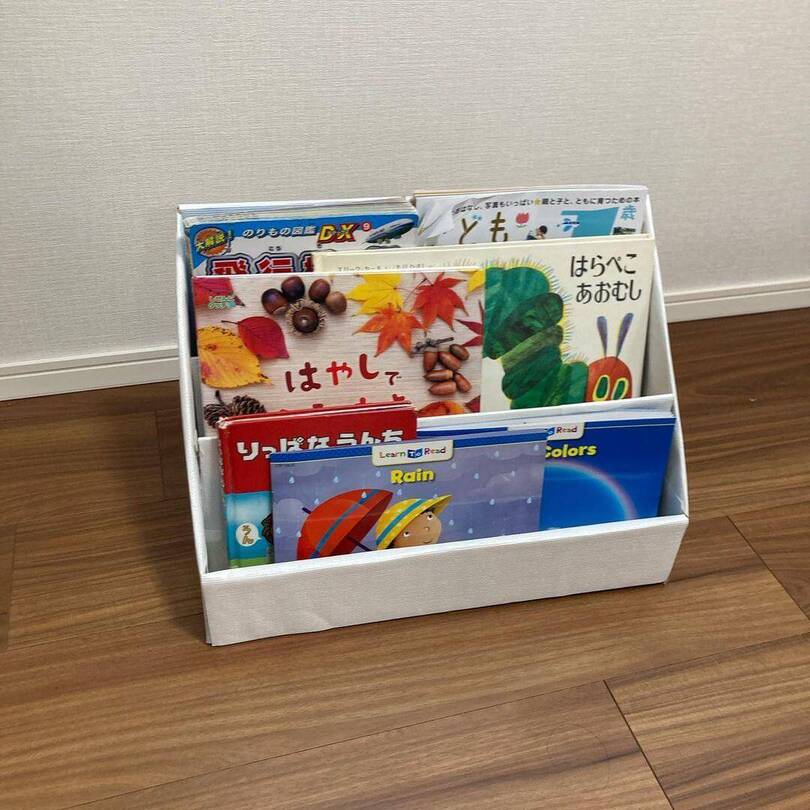 こちらは段ボールとティッシュの空き箱を使って作られた絵本棚。絵本の表紙が見えることで、お子さんがいつもは読まない絵本も自ら手に取るようになったんだそう。