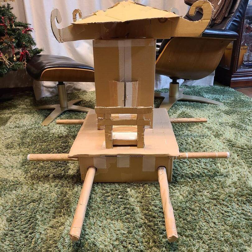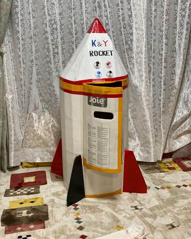 続いての乗り物は、おじいちゃんが孫のために作ってくれたという、今にも発射しそうなロケット!実際にお子さんが中に入ることができるそう。 折り曲げも容易な段ボールだから、形も変幻自在。ビニールテープを使ったシックな色味もかっこいいですね!