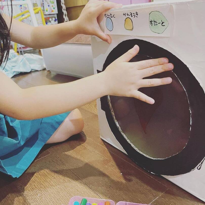 2リットルのペットボトルが入っていた段ボールを使って、便利なドラム型の洗濯乾燥機を制作。手描きのボタンが何ともいえず、かわいいですね!