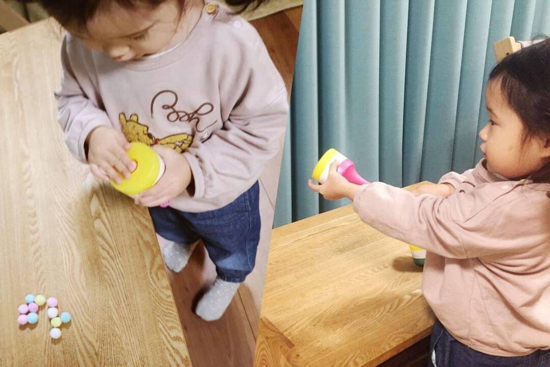 3歳の娘もハマっており、「ポンポン楽しい♪」と上機嫌。「人に向けたらだめだよ」とお約束して毎日遊んでいます。 ボールを穴に入れたり、散らばったボールを拾い集めたりするのも楽しいようです。