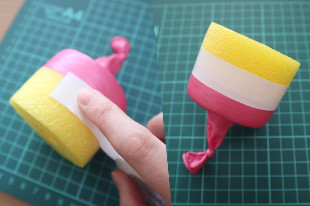 カットしたプールスティックに先ほどの風船をかぶせて、ビニールテープで固定します。これで完成です☆