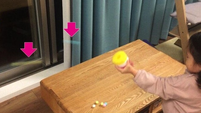 目標物があると楽しいかな?と思い、わが家は玉入れの網に向けて遊んでみました。狙い通りに発射するのはなかなか難しく、大人も一緒に夢中になりましたよ。