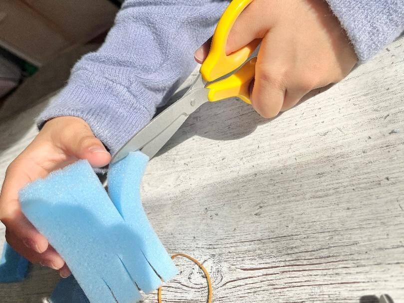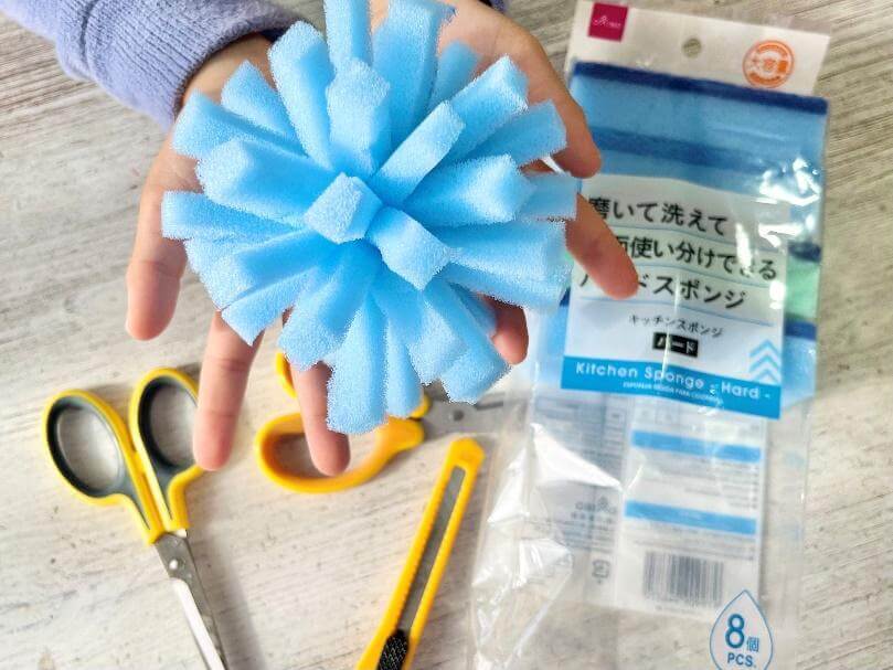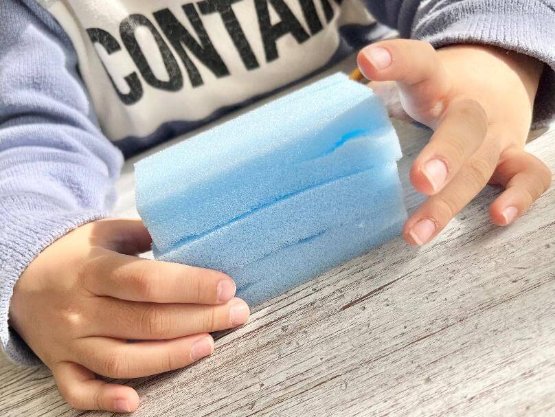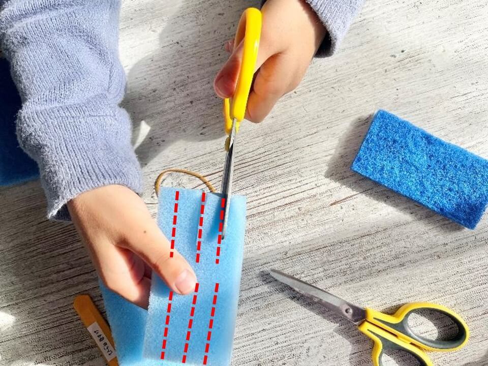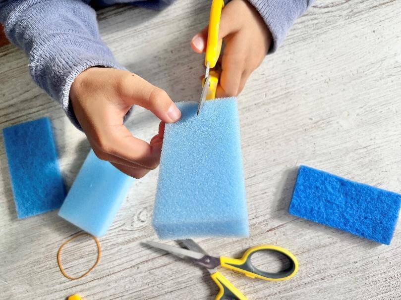 材料は100円ショップで手に入る食器洗い用スポンジと輪ゴムだけ!ハサミを使える子なら作ることができるので、ぜひ一緒に作ってみてください。