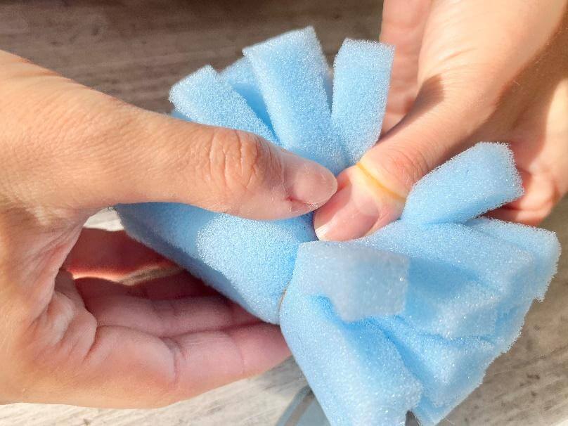 カットするのはスポンジの中心部分の手前あたりまで。中心部分はゴムで縛るので、残しておいてくださいね。