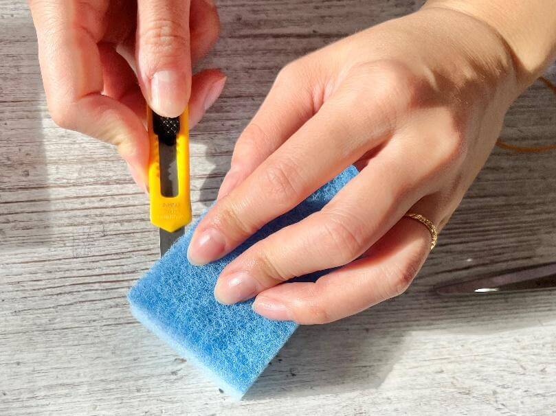 まずは、スポンジの固い部分をカッターを使って切り離します。片方の手でスポンジをしっかり押さえて、もう片方の手でカッターを滑らせるようにしてカットしましょう。