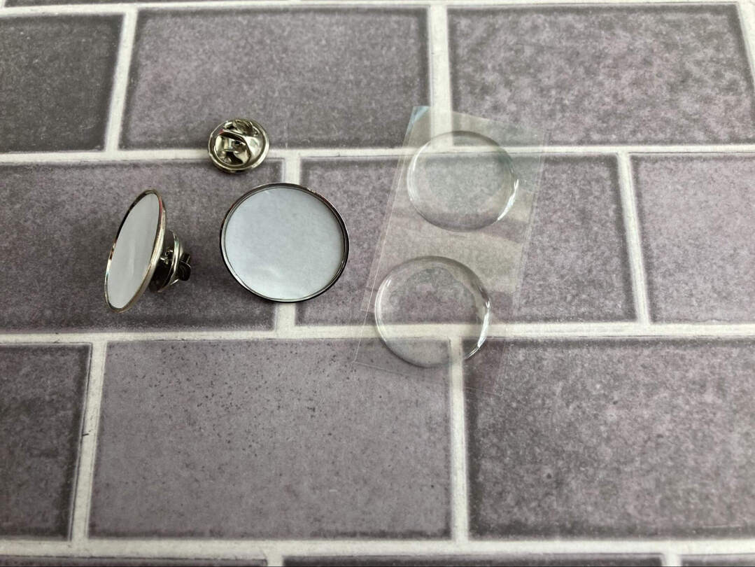 キットには、透明のカバー(ドーム部分)と土台となるプレート、留め具の3つのパーツが入っており、土台とカバーの間に好きなものを挟んでピンを作るしくみです。