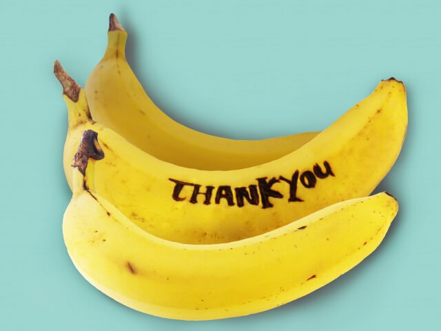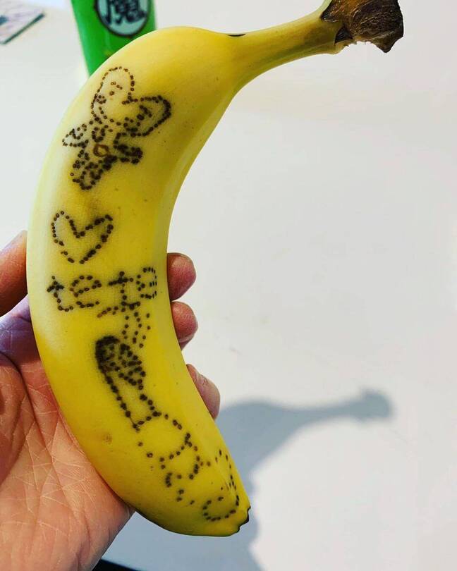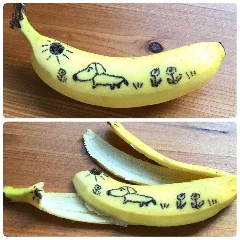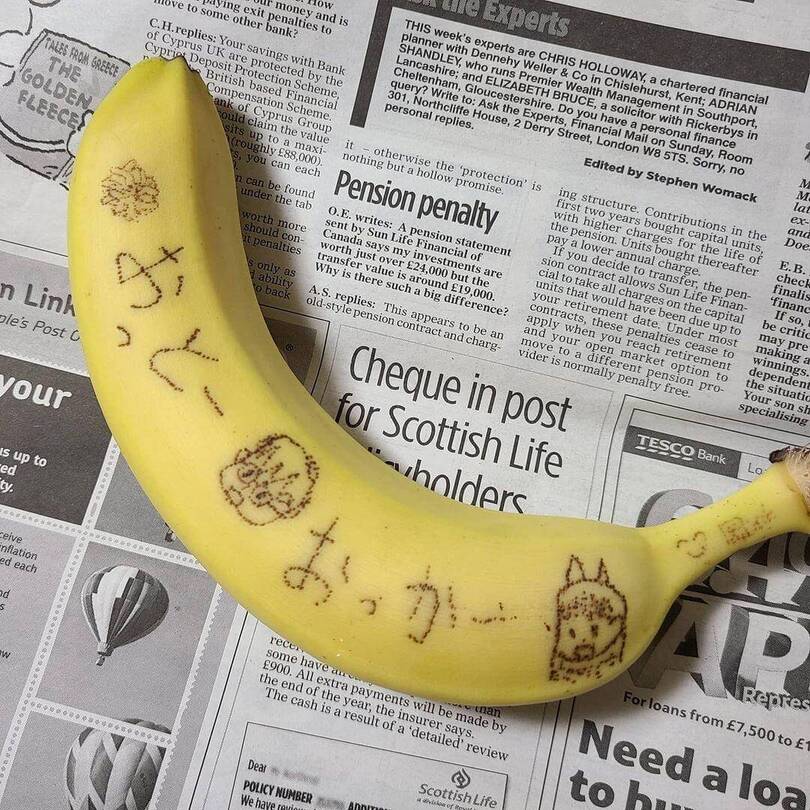1本のバナナ全体を使って、イラストと文字をアート♪