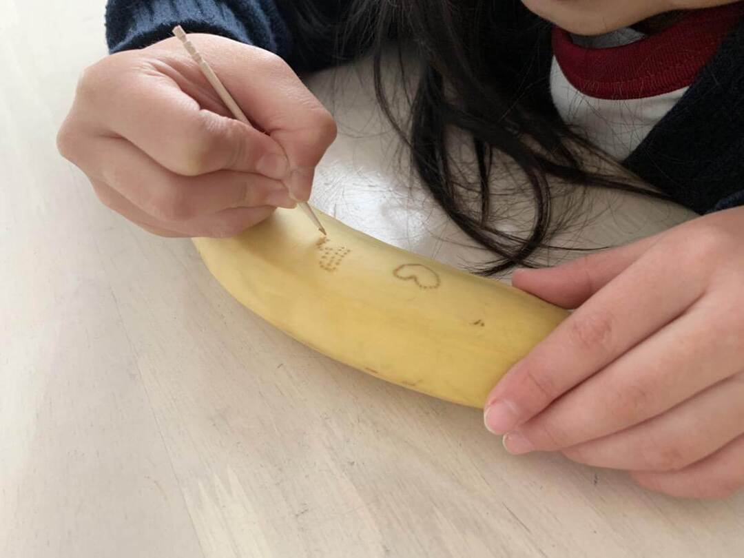 つまようじを使ってバナナの皮に傷をつけながら、絵や文字を描いていきます。少し時間がたつと傷をつけた部分が黒く変色していき、描いたものが浮かび上がってきますよ♪