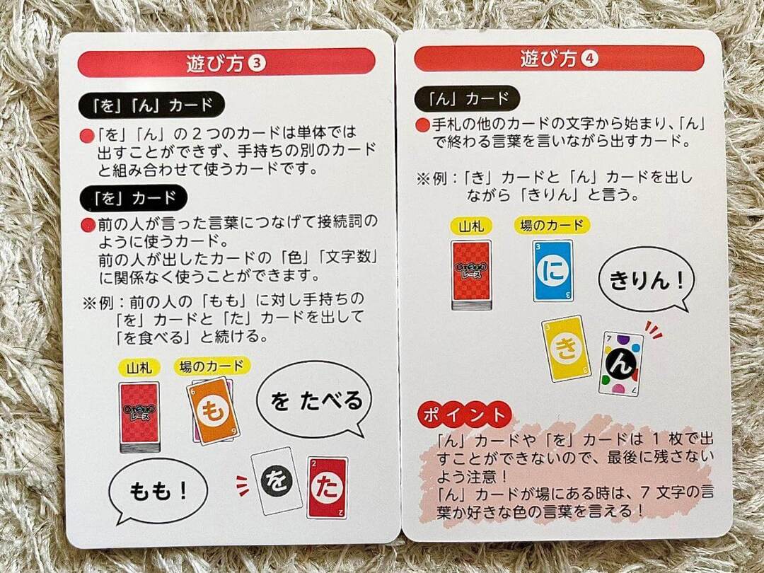 「ん」は、持っている手札のなかから頭文字を選び、「ん」で終わる言葉を探します。例えば場に出ているカードが「3」という数字で、自分の手札の中に「き」があったとします。この場合は「き」と「ん」の2枚のカードを一緒に出して「きりん」と言えば正解!