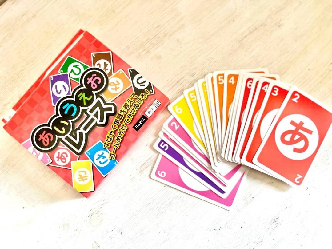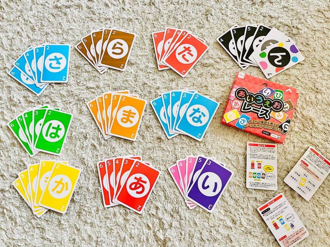 ダイソーの「あいうえおレース」はカラフルなカードにひらがなが書かれた、トランプのような商品。