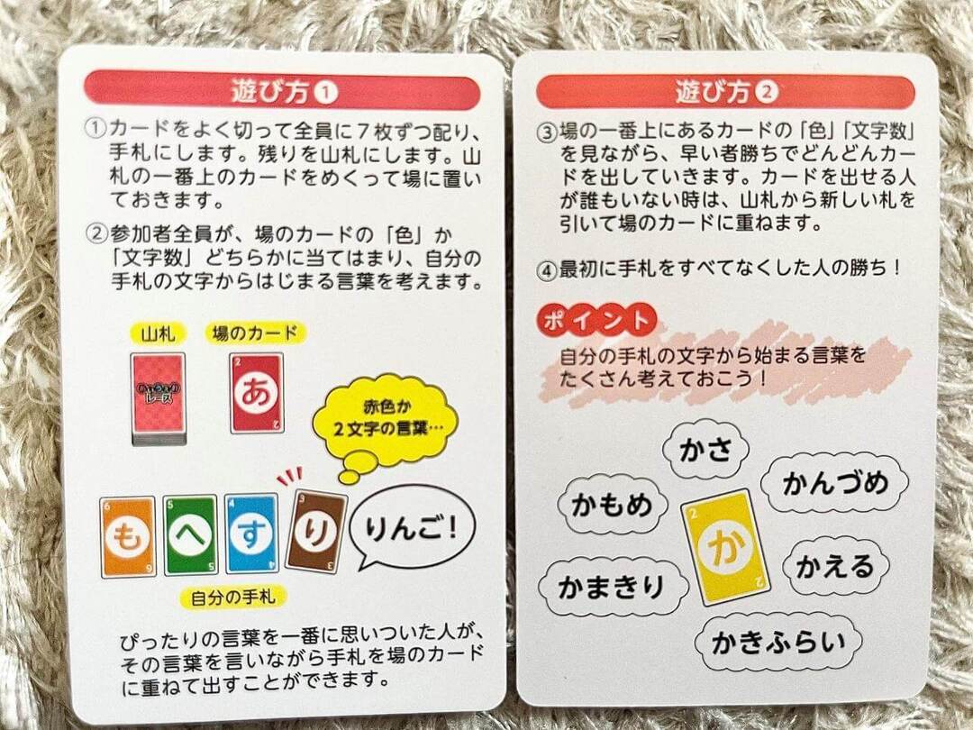 対象年齢は書かれていませんが、しりとりができるぐらいの年齢から遊べます。また大人は文字数が合った場合のみカードを出せる、などハンデをつけやすいのもおすすめなポイント。