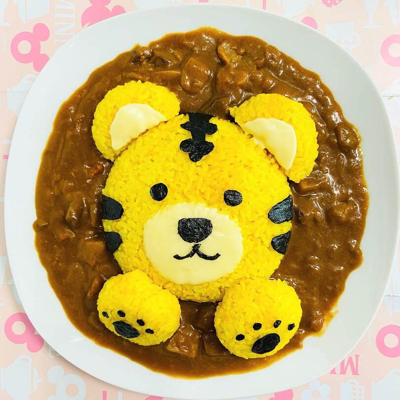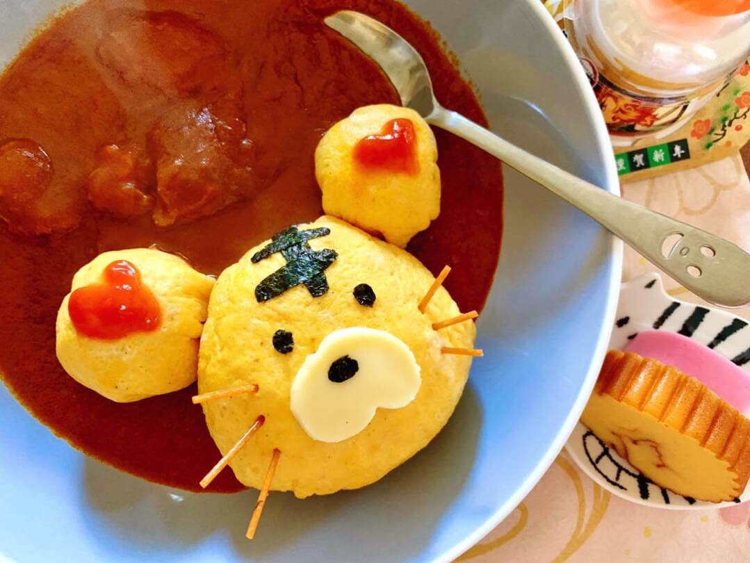 こちらもトラがモチーフですが、ご飯を薄焼き卵で包んでオムカレーに!カレーと卵は相性バツグン、子どもが好きな組み合わせですね。
