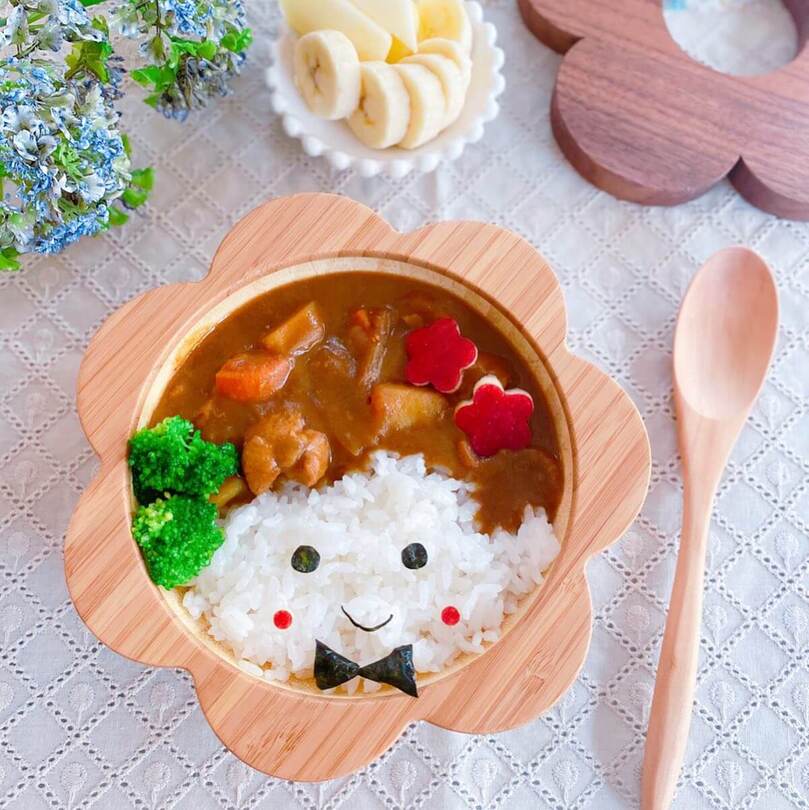 器全体をお顔に見立てたカレー。カレーのルーの部分が頭に、ご飯の上に海苔の蝶ネクタイと、目口をつければたちまちお顔に♡野菜がまるで髪飾りのようでアクセントに!