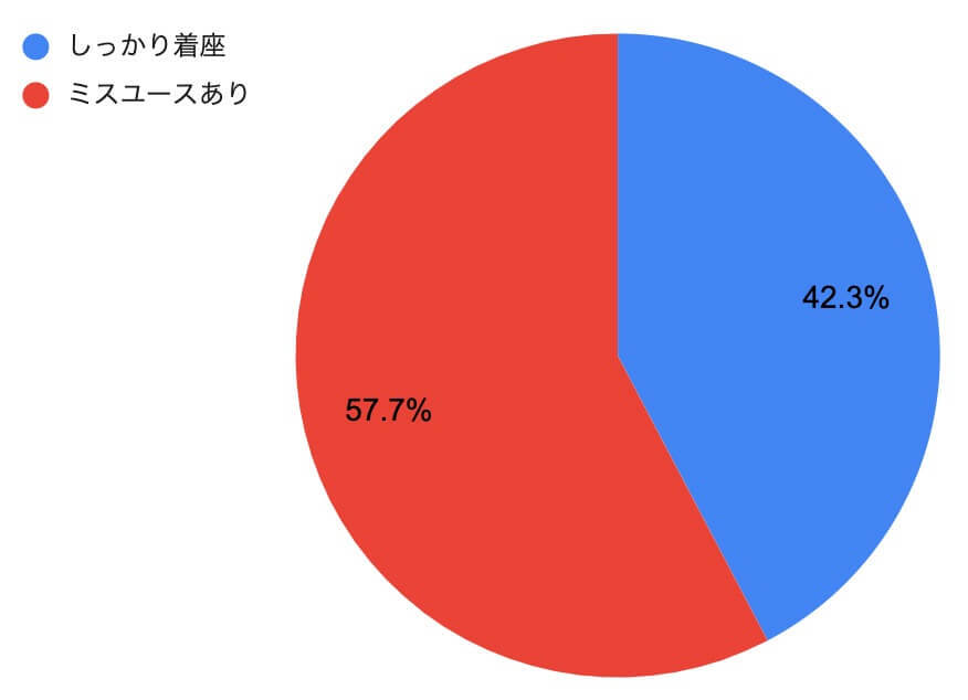 なんと、チャイルドシートを使っている人のうち、誤った使い方をしている人が57.7%!半数近くは正しく付けられておらず、正しく着座できているのはわずか42.3%という結果に。