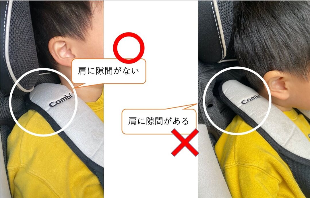 正しくは肩と同じか、少し下から子どもの肩を包み込むようにベルトで固定する方法です。