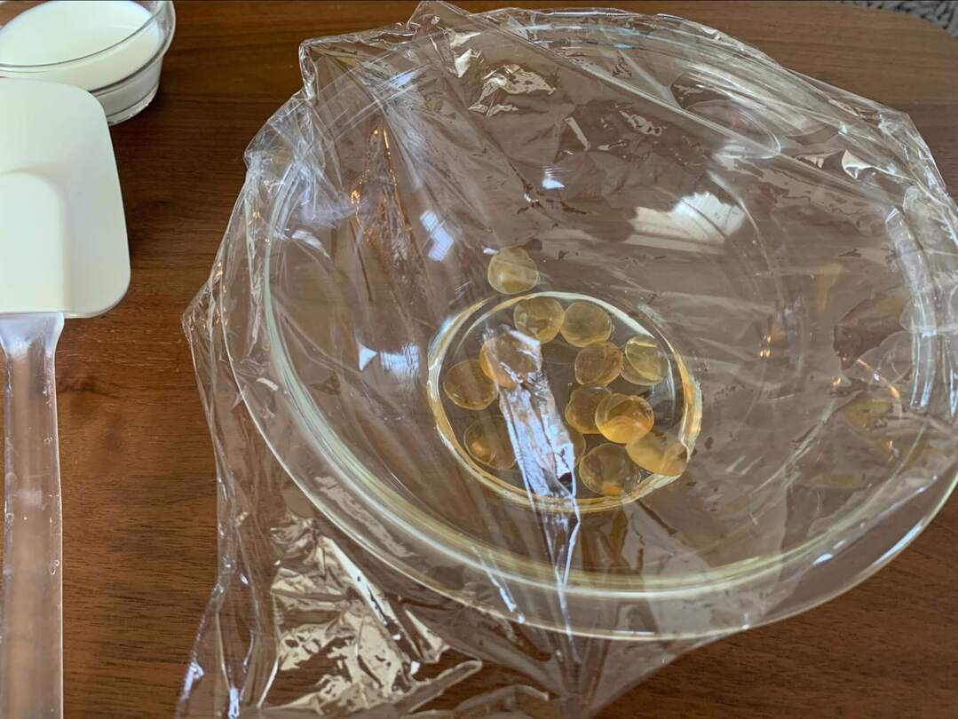 耐熱容器にグミ1袋分と水30ml(大さじ2)を入れ、ラップをふんわりかけて電子レンジ600Wで約1分加熱する。