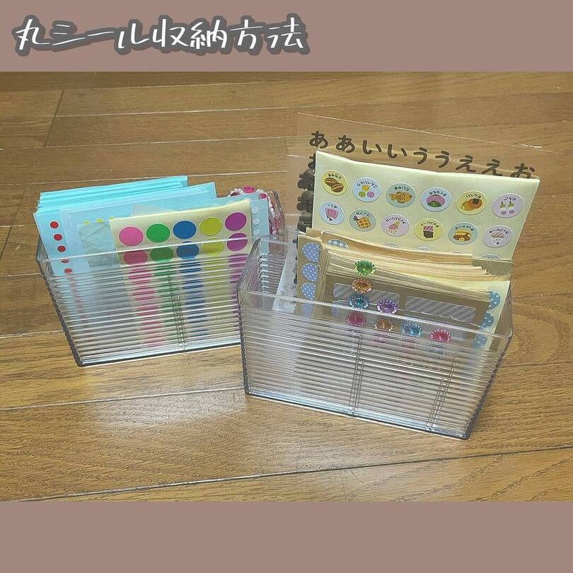 知育でよく使われる丸シールをプラスチックのケースに立てて収納する方法は、保育士のstardropshineさんのアイデア。こちらはダイソーで購入したケースだそう。