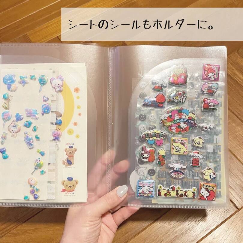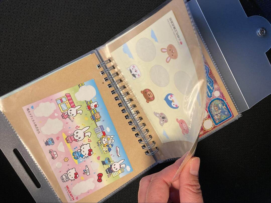 こちらはダイソーの「めくれるフォトスタンドアルバム」を使ったシール収納。本来はプリントした写真を入れて、卓上カレンダーのように飾れる商品ですが小児科などでもらえるシールにサイズがぴったり!