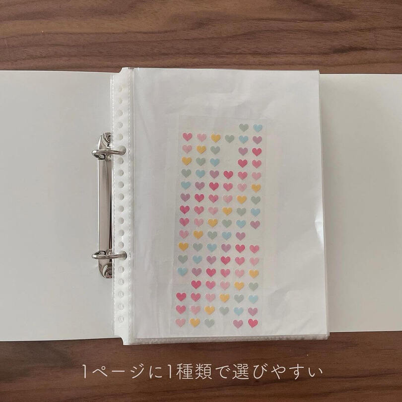 この方法ならどんな大きさや形のシールがあるのか、一目瞭然ですね! ワークなどに使うシールにぴったりの収納方法です。