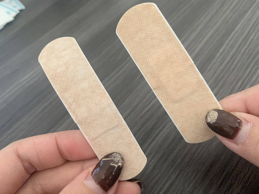 通常タイプと防水タイプがあると説明しましたが、ここで2つの違いを比較してみましょう。 どちらもザラザラとした触り心地の絆創膏ですが、両方をつけた状態で水に濡らしてみると、確かに防水タイプの方は全く水を通さずはがしてみてもパッド部分は濡れていませんでした!通常タイプの方も、そこまで濡れてしまった感じはなかったのですが、はがしてみるとパッドがやや湿っていました。