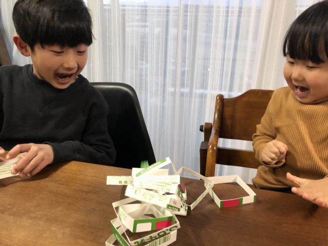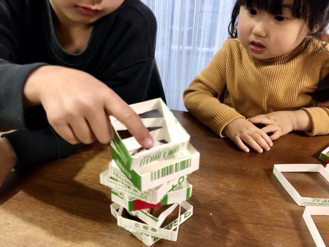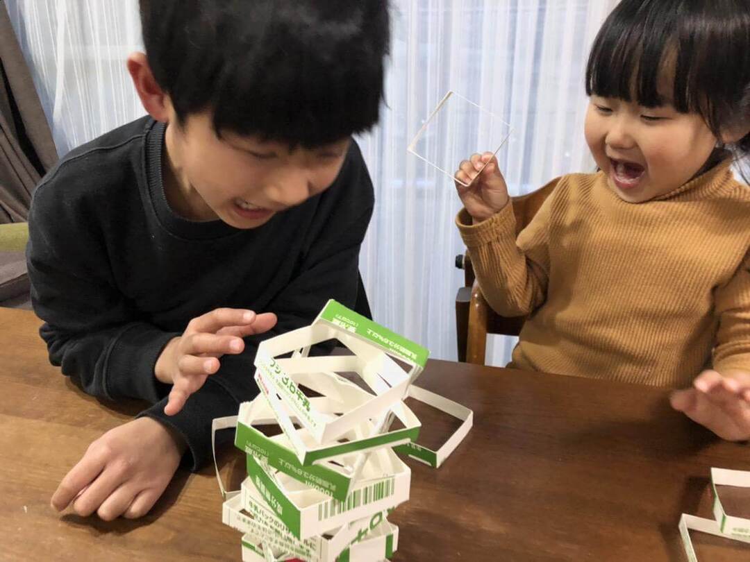 7歳の息子、3歳の娘、筆者の3人で牛乳パックタワーのゲームに挑戦してみました。