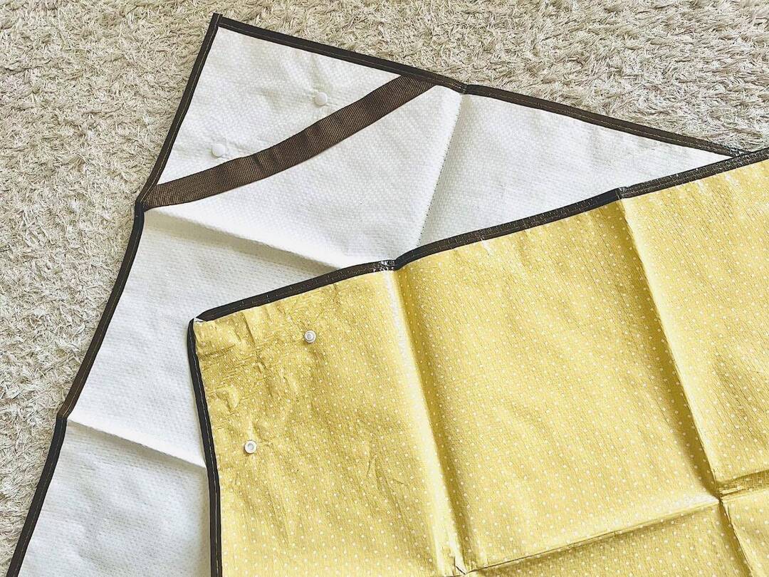 ダイソーの園芸シートは、レジャーシートのような見た目ですが、四隅にボタンが付いており、ボタンを留めることで簡単に箱型に組み立てられます。