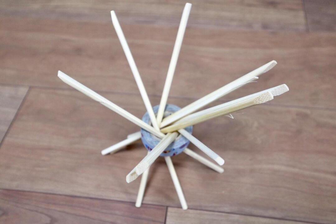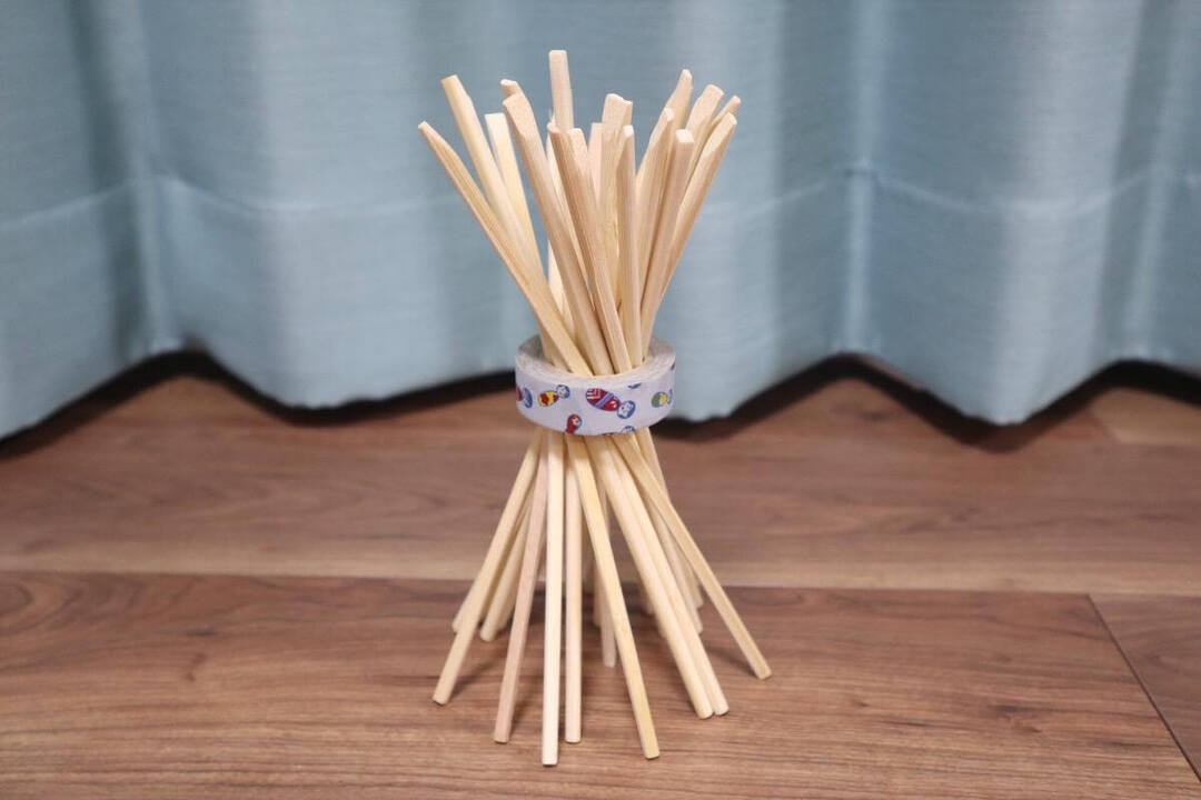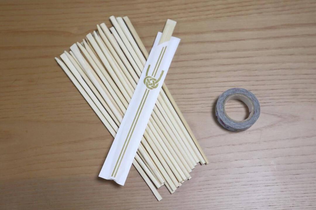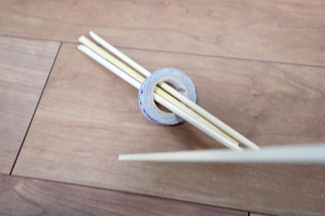 今回は割り箸を11膳使いました。割り箸は輪っかに入るだけの本数を用意しましょう。輪っかは今回マスキングテープを使いましたが、牛乳パックなどを切って作ってもいいですね。